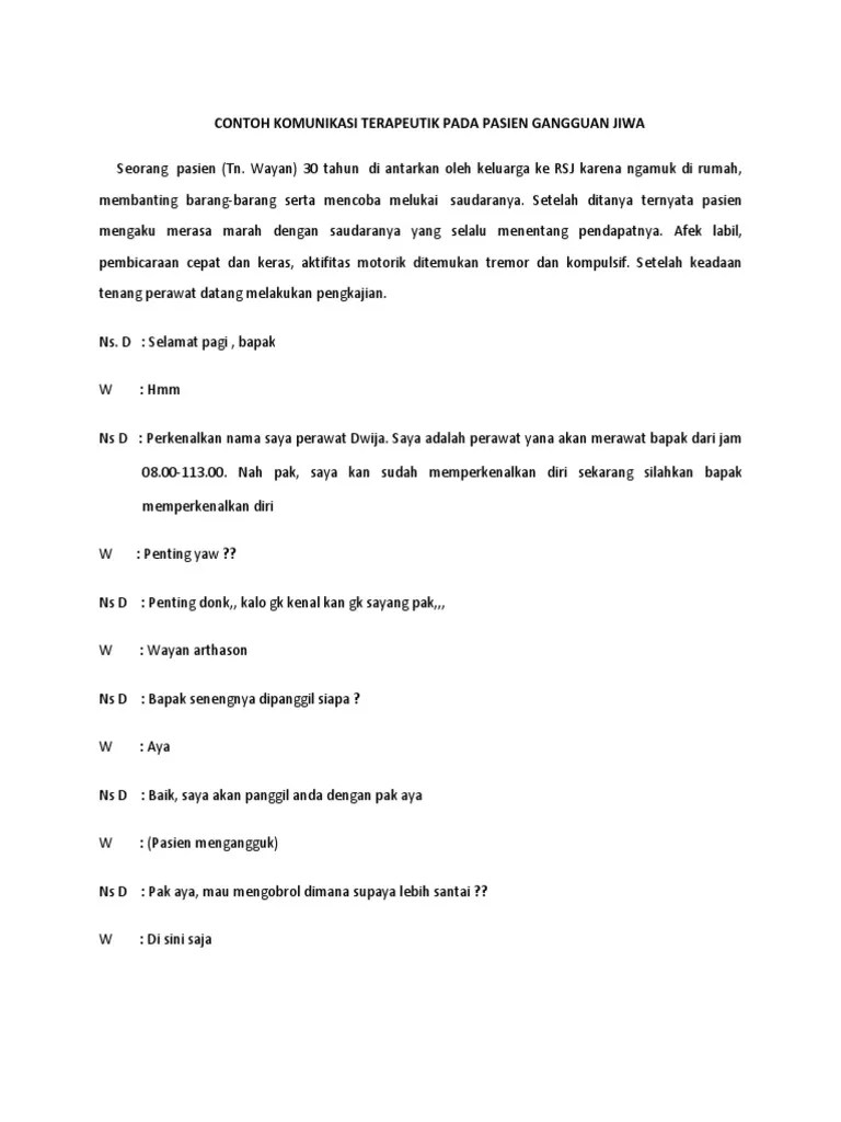 Contoh komunikasi terapeutik pada pasien gangguan jiwa · ns. Penelitian ini bertujuan untuk mengetahui dan menganalisis komunikasi terapeutik pada pelayanan spiritual antara rohaniawan dan pasien gangguan jiwa. Analisis komunikasi terapeutik perawat dalam pemulihan pasien. Penerapan komunikasi terapeutik perawat terhadap pasien depresi dengan gangguan isolasi sosial di rsjd dr. Amino gondohutomo provinsi jawa tengah.
