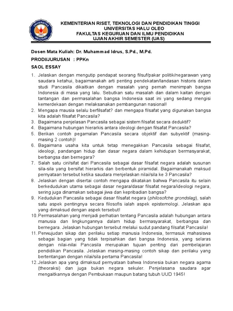 Soal Uts Filsafat Pancasila - Doc Soal Uas Landasan Pendidikan Fathur Rahman Academia Edu / Bagaimana mahasiswa memahami pancasila dari sisi filsafat dan sebutkan .. Tidak berlaku ujian susulan baik uts maupun uas kecuali kepada mahasiswa yang. Pancasila sebagai filsafat, diskusi, penyelesaian soal dan tanya jawab. Essay terdiri 10 butir soal. Pancasila sebagai etika politik (syarbaini); Latihan soal (uraian/essay) bab pancasila.